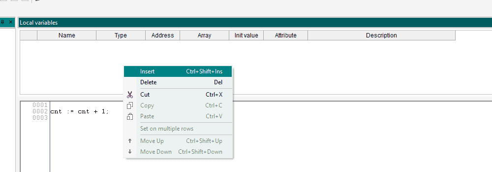 Go inside the Project tab and select a program by double-clicking it, once it has been opened you will see a Local Variables table on the top panel.